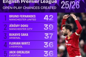 本赛季英超运动战创造机会次数:B费42次第一,多库萨卡二三位