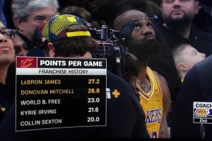 骑士主场迎战湖人,转播方晒出骑士队史场均得分前五: