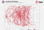 根据OPTA的数据统计,拜仁慕尼黑的中后卫乔纳森·塔在2025-26赛季欧冠联赛阶段的传球准确率是所有球员中最高的,达到了惊人的97%。