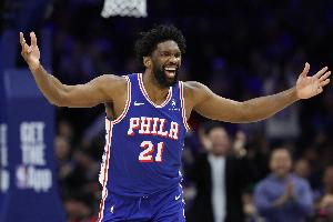 本赛季恩比德场均砍下25.7分7.4篮板3.9助攻,76人目前26胜21负排名东部第六。