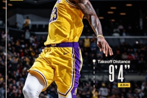 老詹今日对阵篮网暴扣垂直起跳80.3厘米&滑行2.9米 球过筐时速57.5公里