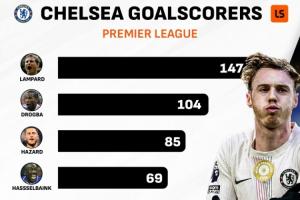 切尔西英超历史进球榜:帕尔默升至第8位!
