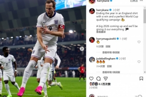 凯恩社媒晒出庆祝进球的照片,并写道:“以一场胜利和完美的世预赛为今年的国家队征程收官,重要的2026年即将到来,我们将全力以赴。”