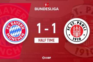 半场-拜仁暂1-1圣保利 格雷罗扳平迪亚斯倒地助攻卡尔比朔夫中柱