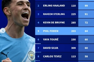 体育资讯11月30日讯 在本轮英超,曼城3-2击败利兹联,福登梅开二度。以下为曼城队史英超射手榜: