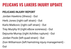 德章泰穆雷(右跟腱断裂)、乔丹普尔(右股四头肌拉伤)、锡安威廉森(左腿筋伤病管理)。