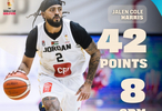 此役,约旦归化球员、前同曦外援杰伦·哈里斯表现神勇,他登场29分56秒24投13中,三分16中8、罚球9中8,狂砍42分6篮板2助攻2抢断,正负值+49。