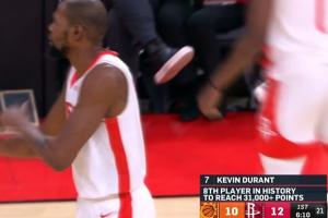 杜兰特得到本场第4分,个人生涯得分突破31000分大关,成为NBA历史上第8位得分破31000的球员!