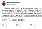 彭南特在社交媒体上这样写道:“我真的受够科纳特了,连续第四场比赛因为他的失误导致丢球。科纳特身体强壮、速度也快,但也就这样了——他在技术层面惨不忍睹,身高 6英尺4英寸(约1.93 米)却赢不了高空球,传球水平堪比业余联赛球员。”