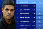 阿尔特塔场均在欧冠拿2.13分并总共拿了64分居首,恩里克和安切洛蒂分别拿到61和60分排列二三。