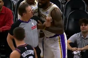 GIF-詹姆斯抓着裁判抱怨狄龙触球