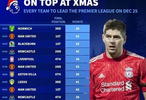 德转盘点了各英超赛季半程冠军(截止到12月25日)积分以及赛季末名次。