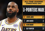 圣诞三分榜TOP10!老詹独占第1掘金穆雷冲至第7仅雷迪克非现役