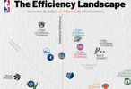 直播吧12月27日讯 今天,美媒Kirk Goldsberry晒图统计了NBA过去10场比赛所有球队的攻防效率,详情入下: