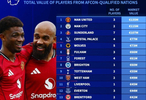 #曼城[超话]# 德国转会市场统计了英超各队将参加非洲杯球员的身价,并列出排名,曼联三人价值1.35亿欧居首,曼城两人价值1.15亿欧次席。