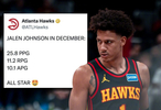 杰伦-约翰逊12月份场均三双25.8分11.2篮板10.1助攻!他也成为NBA历史第7个单月场均砍下25分三双的球员!