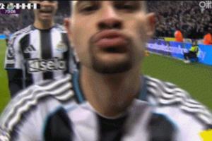 体育资讯01月05日讯 英超第20轮,纽卡在主场2-0战胜水晶宫队,在比赛第71分钟,吉马良斯进球后做出了亲吻镜头的庆祝动作。