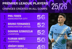 Squawka统计了本赛季在各项赛事创造最多次机会的英超球员,详情如下:
