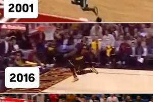 詹姆斯转发了媒体发布的他分别在2001年、2016年及2026年完成招牌式抢断后大风车扣篮对比画面。