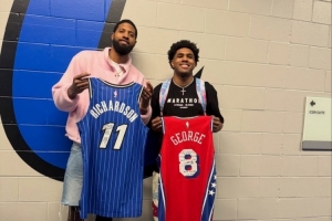 体育资讯1月11日讯 昨日,76人客场103-91击败魔术,赛后乔治和魔术新秀杰斯·理查德森交换球衣并合影。