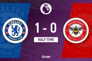 上半场伤停补时3分钟,半场结束,切尔西暂1-0布伦特福德。