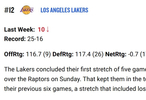 NBA官方今天更新球队实力榜,前三是雷霆,活塞,马刺。湖人已经跌出前10,现在是第12位。