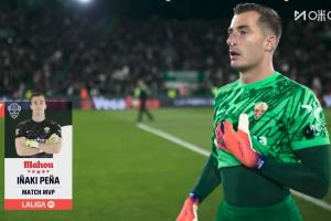 体育资讯11月24日讯 皇马在本轮西甲对阵埃尔切,埃尔切门将佩尼亚在赛后被官方评为全场最佳球员。