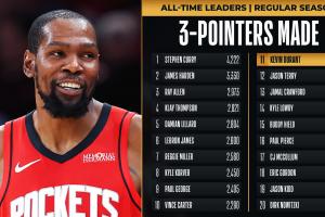 本场比赛上半场,杜兰特命中两记三分,生涯三分数来到2283个,超越贾森·特里,升至NBA历史第11,排在第10的是文斯·卡特(2290个)。