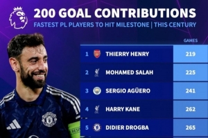 新世纪最快参与英超200球榜:亨利压萨拉赫居首,B费第10